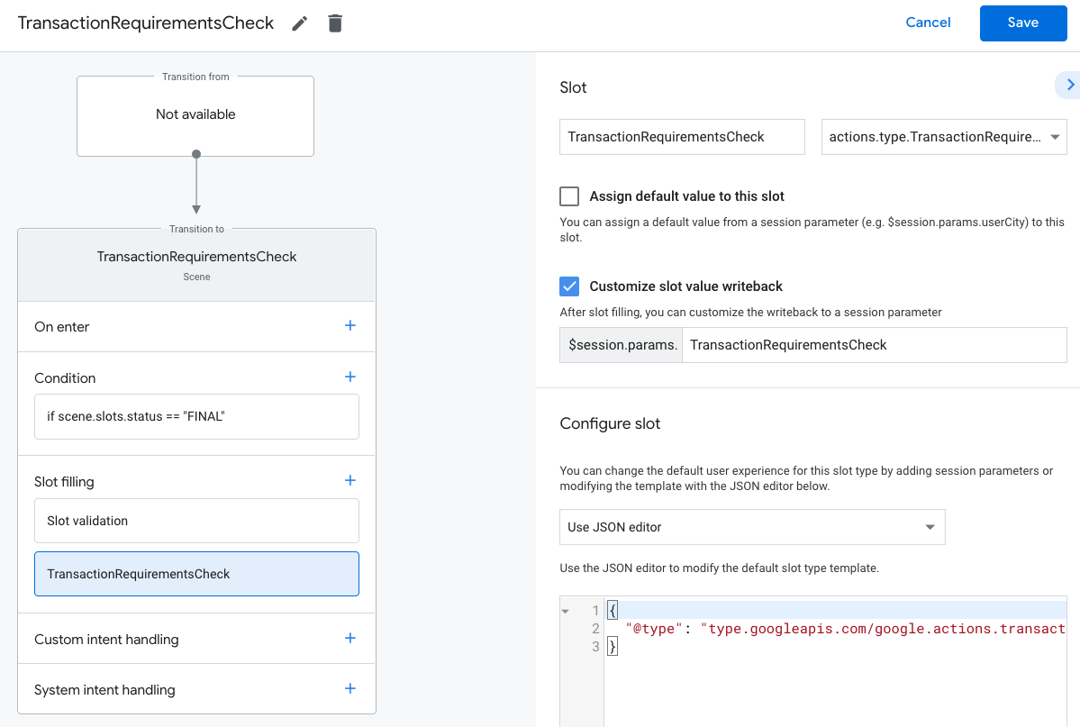 actions.type.TransactionRequirementsCheckResultas the slot type. - In the slot name field, give the slot the name