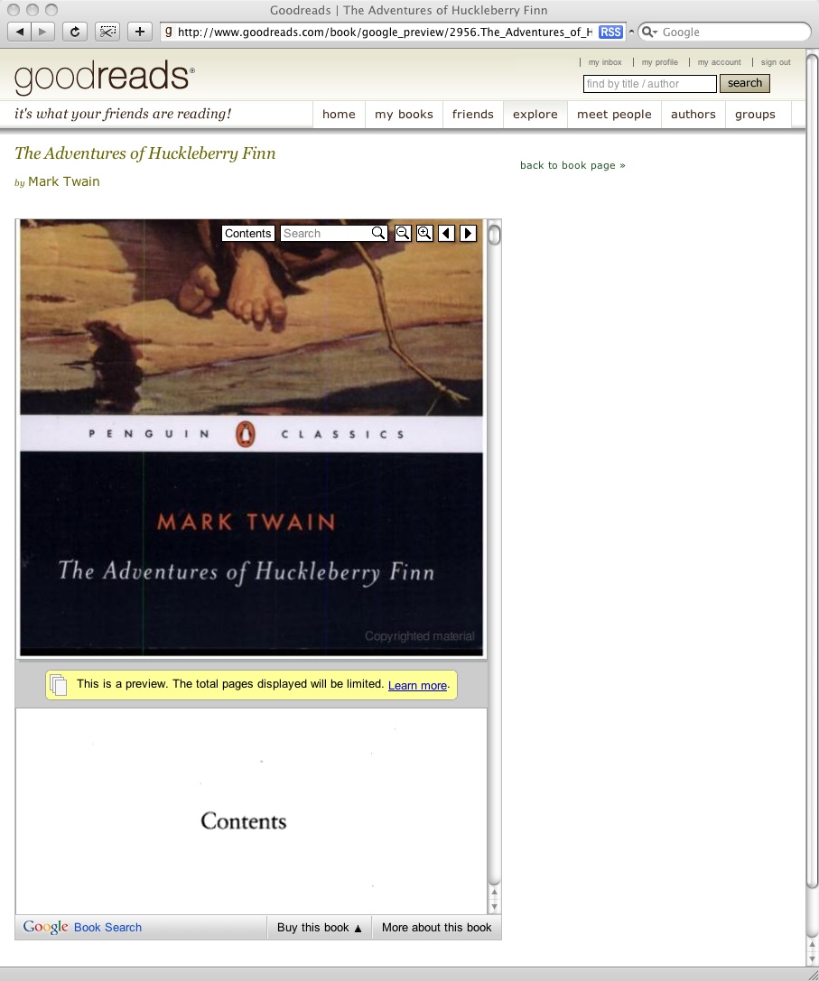 Goodreads excels at helping people find what books they want to read, through recommendations from friends or other readers with similar tastes. However, unlike in a real bookstore, members can't pick a book up they think they want to read and flip through it. Embedding the preview of a book using the Google Book Search Apis is going to help change that, enabling members to browse through the books online right on the site. This will be a very valuable service to members who are curious about a book and are considering reading it.