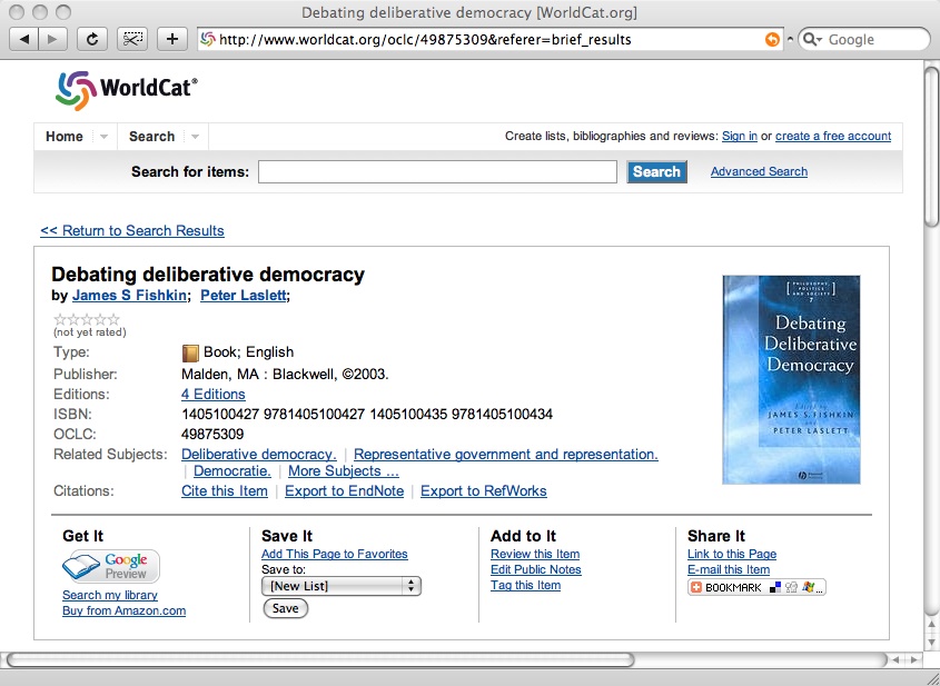 WorldCat.org lets you search the collections of the more than 10,000 libraries which participate in the OCLC cooperative. WorldCat libraries are dedicated to providing access to their resources on the Web, where most people start their search for information.