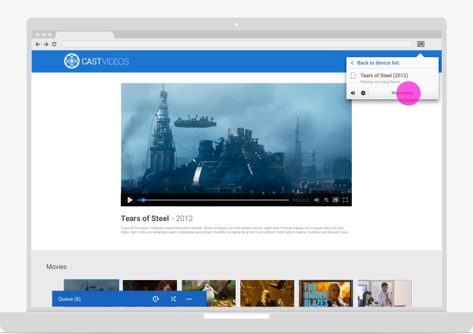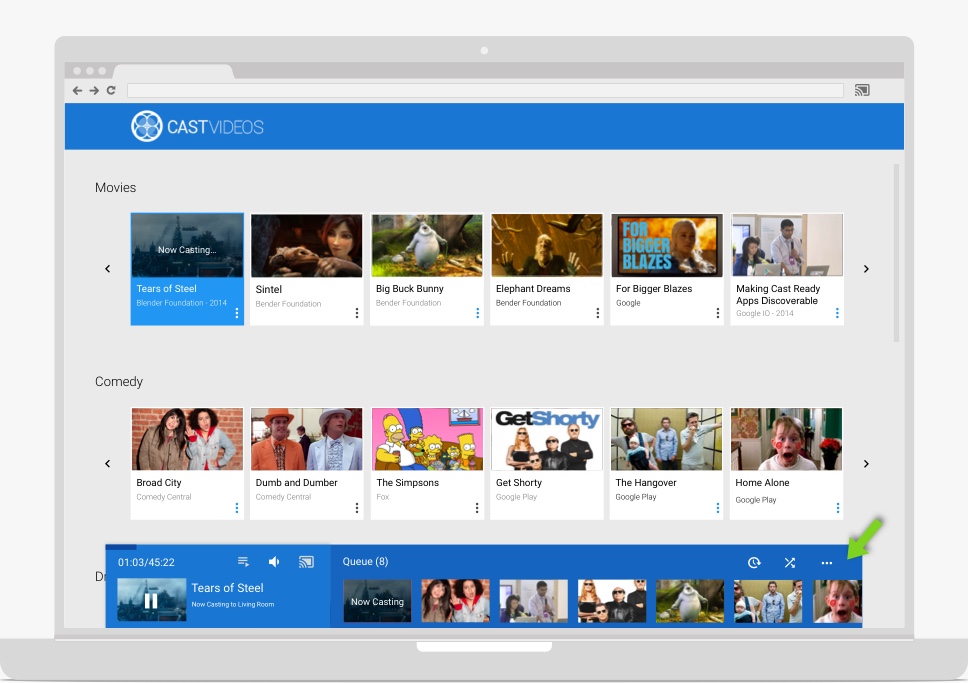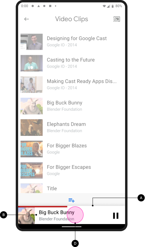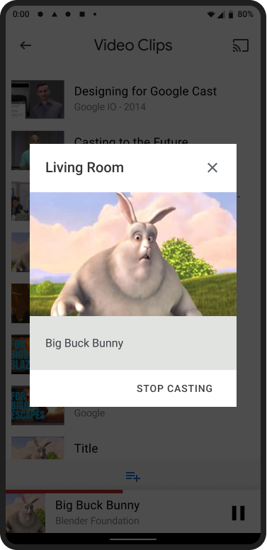 A small, persistent control known as the mini controller should appear, while casting, when the user navigates away from the current content page or expanded controller to another view within the sender app. The mini controller is a visible reminder of the current cast and provides instant access to it.