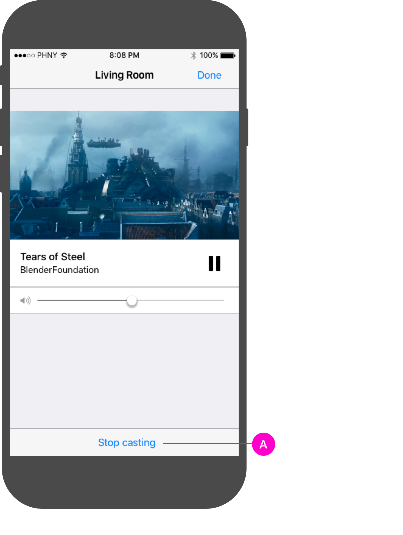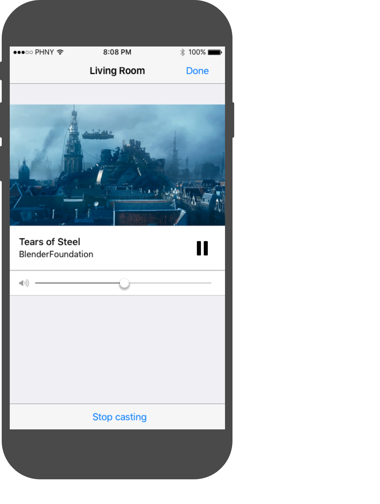 Sender apps should provide an expanded controller for content being cast, displaying content information and relevant controls.