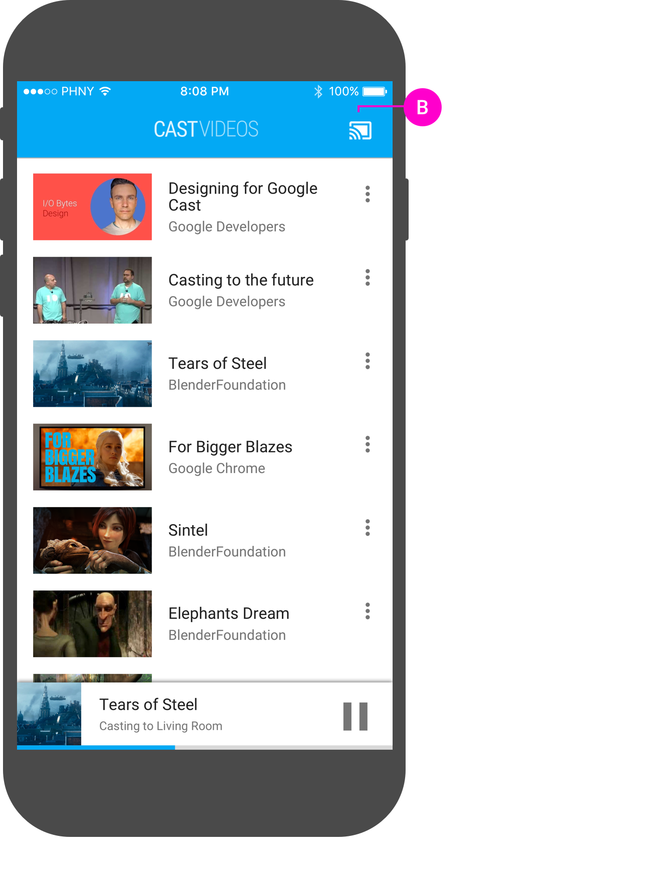 The sender app's Cast playback status and controls across these areas must be in sync with playback changes happening on the Web Receiver, even when not originated by the sender app. This will allow proper handling of both multi-sender commands and the playback control coming from the device’s remote controls, buttons, etc.