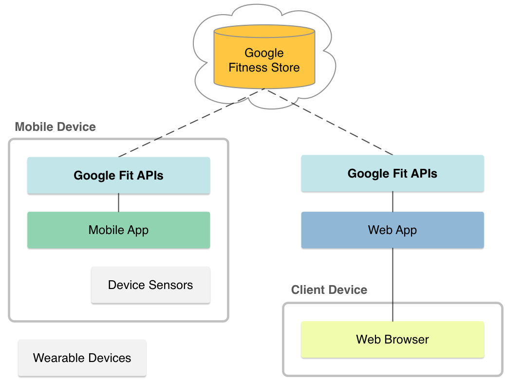 - Android and REST APIs to access the fitness store. You can create apps that support Google Fit on multiple platforms and devices, such as Android, iOS, and Web apps.