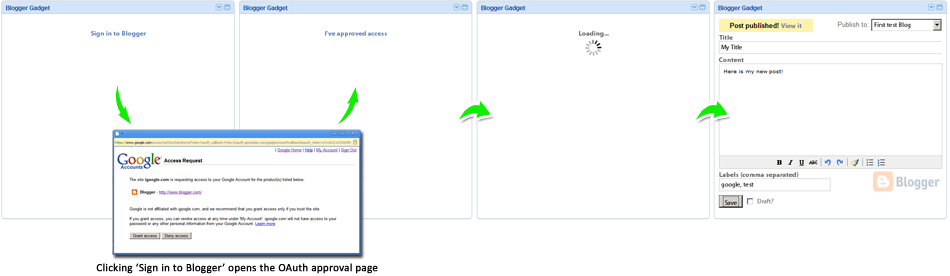 response.oauthApprovalUrl) where we'll send the user to login. The gadget displays the "Sign in to Blogger" and sets its href to the value ofoauthApprovalUrl. - Next, the user clicks "Sign in to Blogger" and the OAuth approval page opens in a separate window. The gadget waits for the user to finish the approval process by displaying a link: "I've approved access".