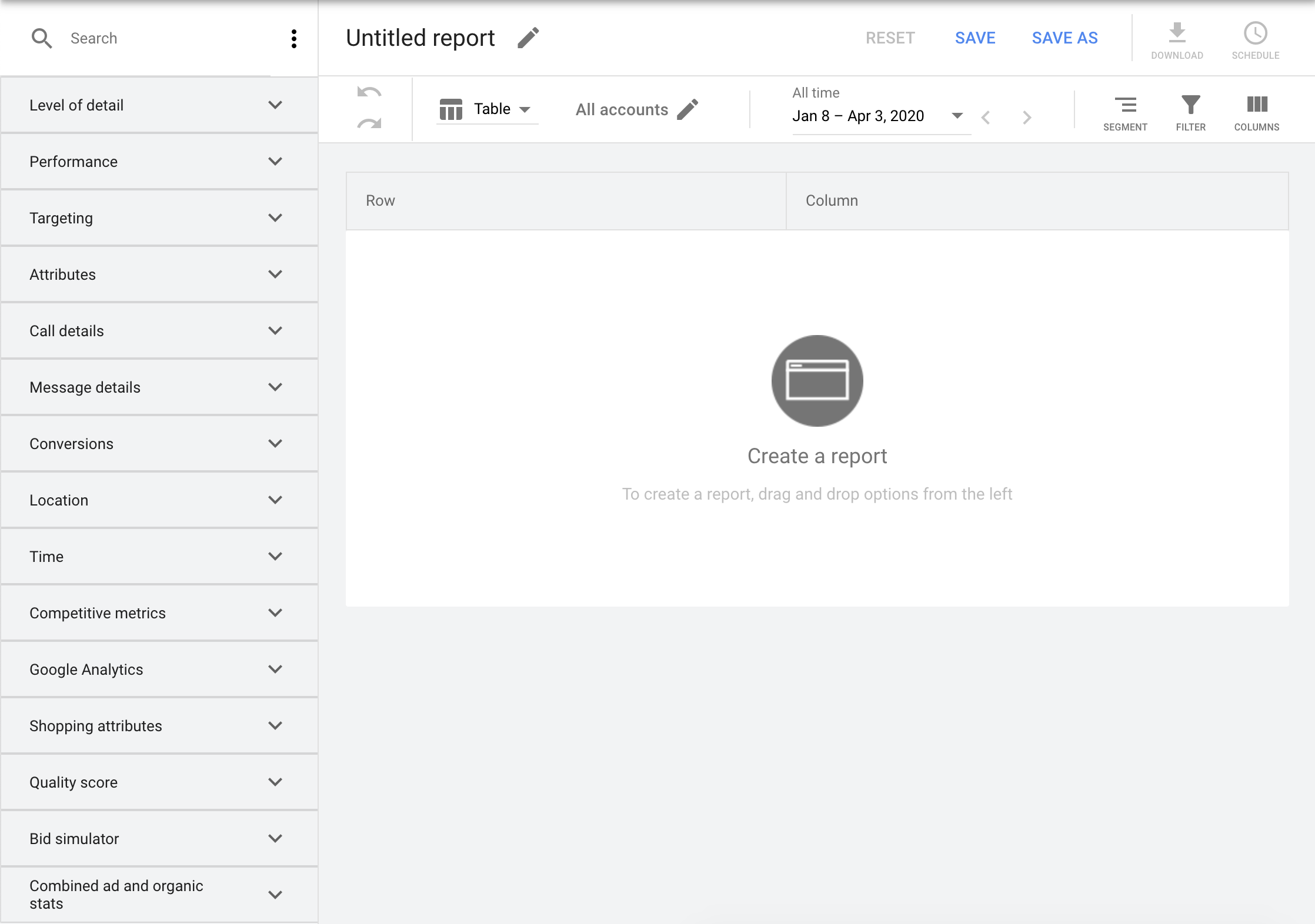 Columns in the UI are equivalent to Resource fields, Segment fields, and Metrics in GAQL.