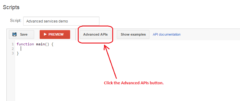 To see which Google APIs are available as advanced APIs, click the Advanced APIs button on the top editor bar.
