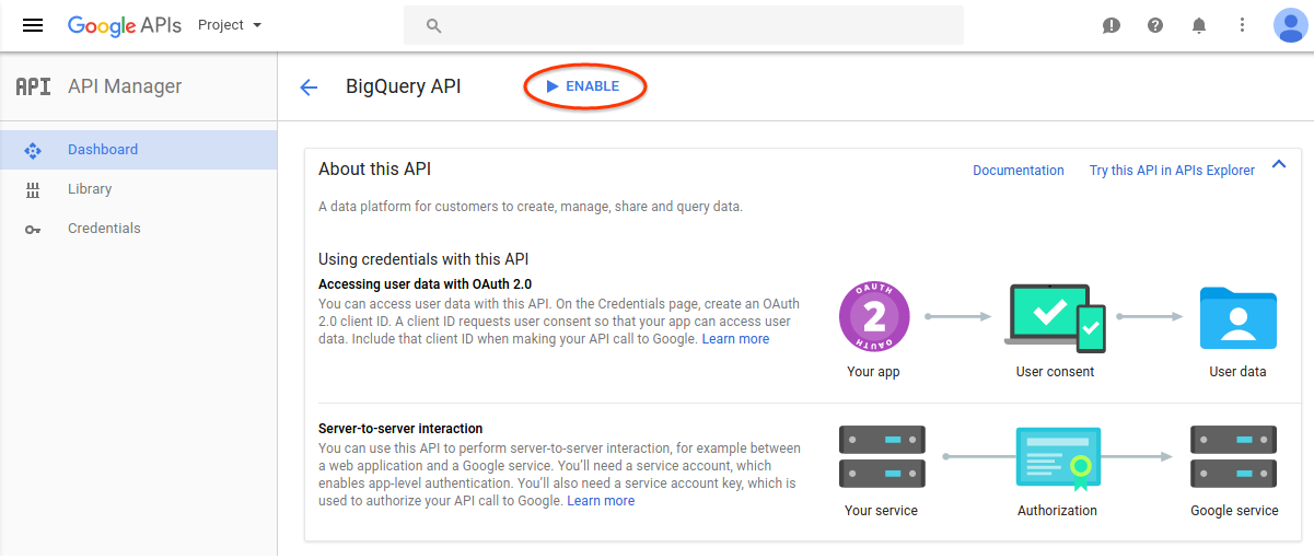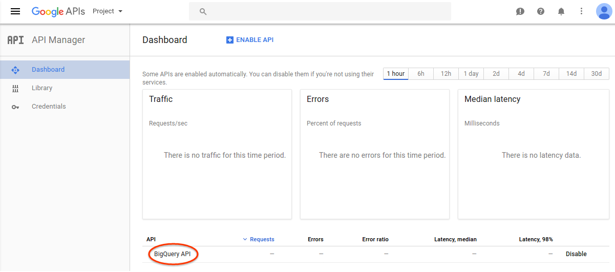 To view the list of enabled APIs for the project, select the Dashboard page. Verify that all the Advanced APIs you want to use for the script are listed.
