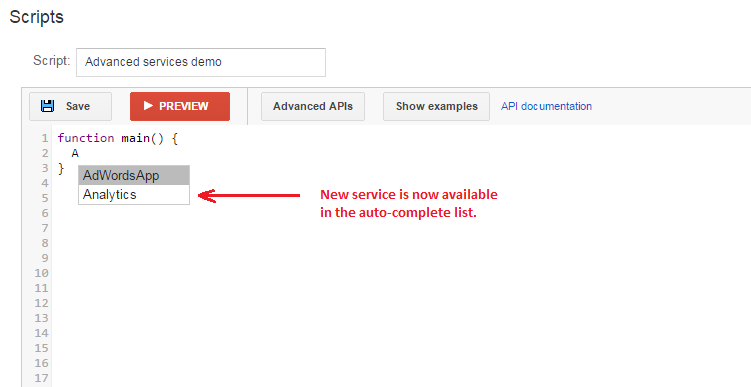The advanced APIs in Google Ads scripts let experienced developers connect to certain public Google APIs with less setup than using their HTTP interfaces. You use these APIs much like scripts' built-in services, and they offer the same conveniences like auto-completion and automatic authorization.