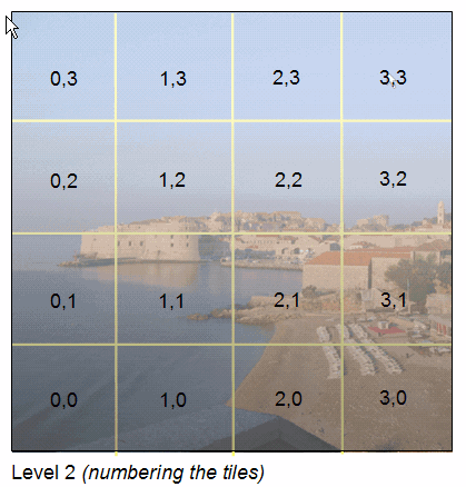 The following figure illustrates numbering of the tiles at level 2 of the 10-megapixel image, with the origin in the lower left: