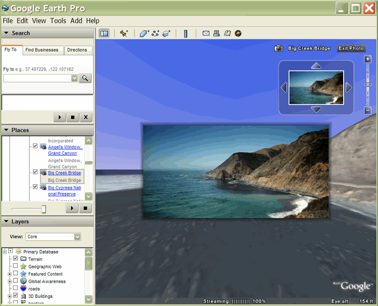 Earlier releases of KML allow you to include small photographs in description balloons attached to placemarks in Google Earth. Entire layers, such as Panoramio, consist of user-contributed geolocated photos. To view these photos, the user must click the placemark icon (or click the name in the List panel) to open the balloon containing the photo.