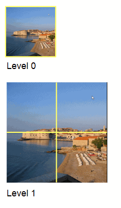 The following illustrations show Levels 0, 1, and 2 of a sample image pyramid.