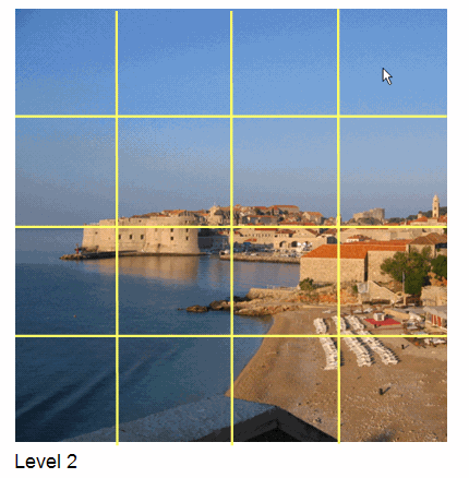 6. Subdivide into tiles. The image at this level consists of a grid of 4 * 4 tiles (level 2).