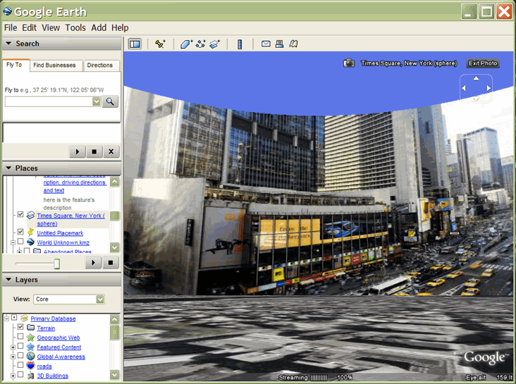 The new <PhotoOverlay> element allows you to geographically locate a photograph on the Earth and to specify the placement and orientation of the Camera that views this PhotoOverlay. The PhotoOverlay can be a simple 2D rectangle, a partial or full cylinder, or a sphere (for spherical panoramas). The overlay is placed at the specified location and oriented toward the Camera.