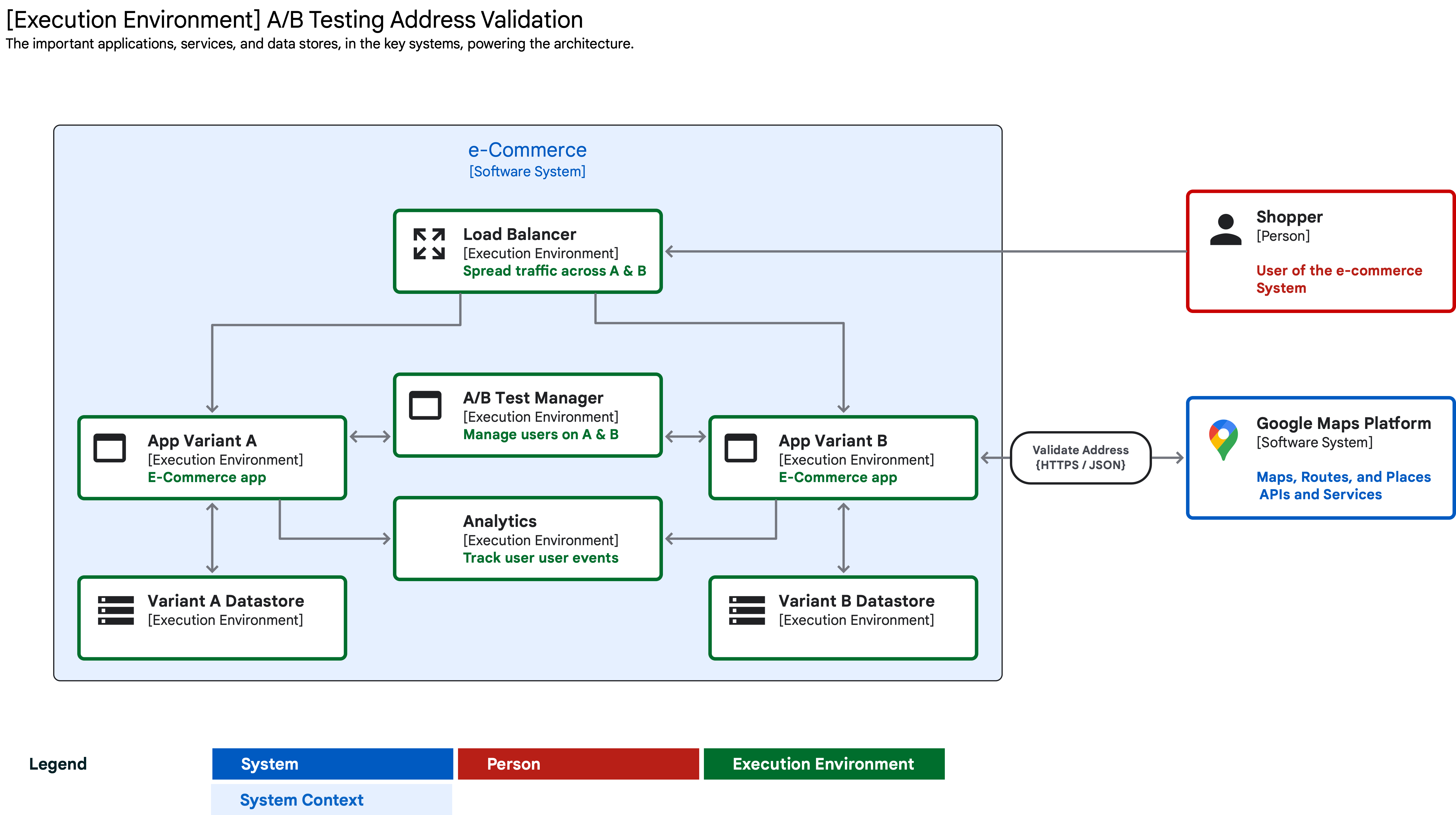Let's look at A/B testing Address Validation in an ecommerce use case. The architecture diagram below shows how a customer would interact with your commerce experience allowing you to determine the more effective validation strategy.