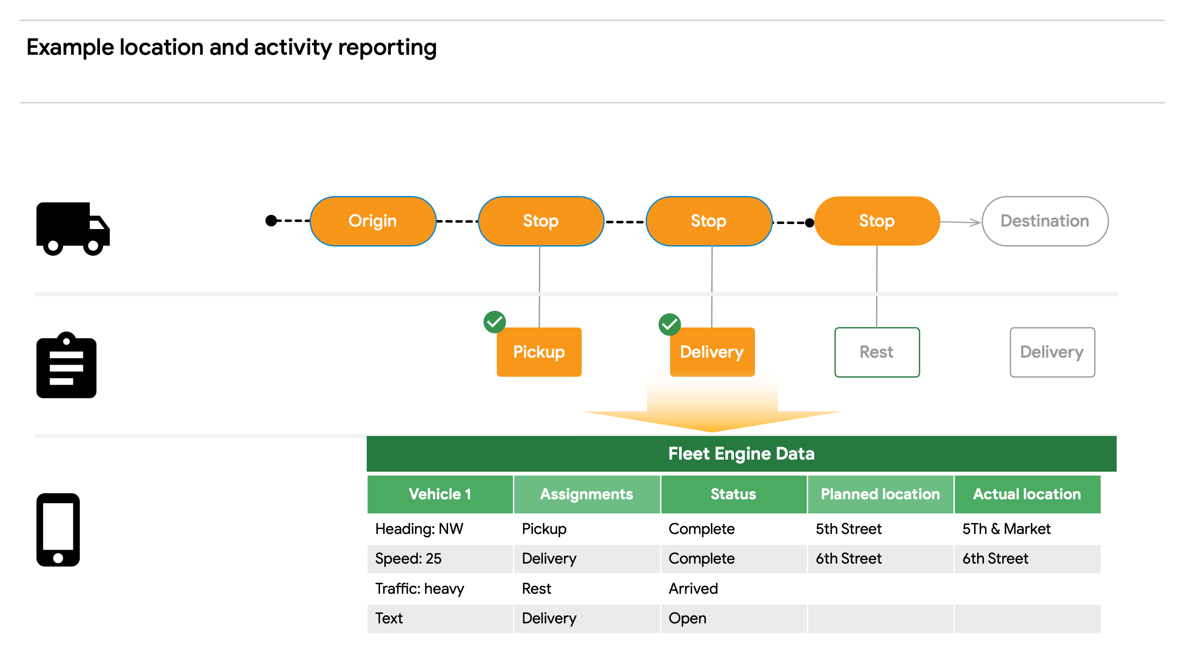 The illustration here represents the vehicle as a vehicle-device pair. The assumption is that the driver uses a device that runs your driver application. Throughout the day, your app sends a stream of location updates to Fleet Engine. The driver also uses the app to accept assignments and mark them complete before leaving the a stop. Fleet Engine stores this data, and you have access to the combined location information and business activity status for the journey to build solutions for your fleet operator as you see fit.
