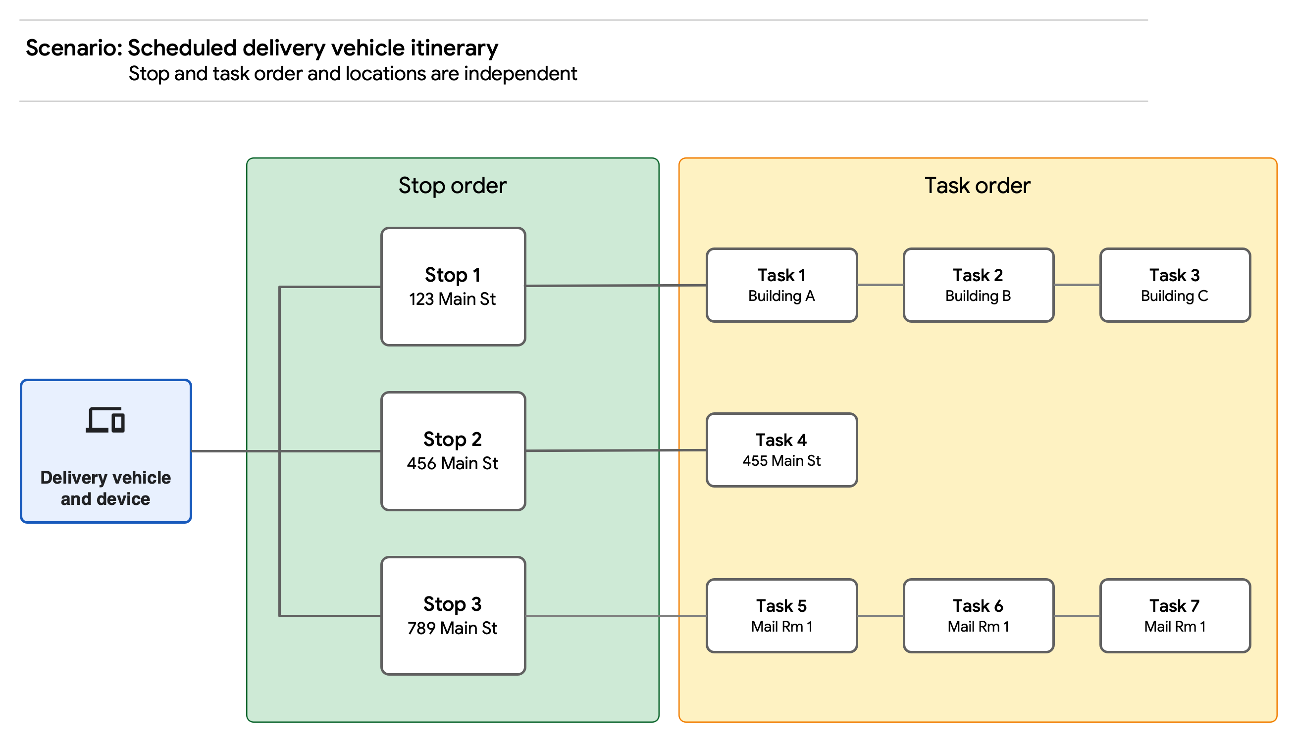 - For scheduled stops, a stop contains the list of tasks to be completed at the vehicle stop location, such as delivering and picking up a number of packages. You might also assign scheduled breaks at a given stop.