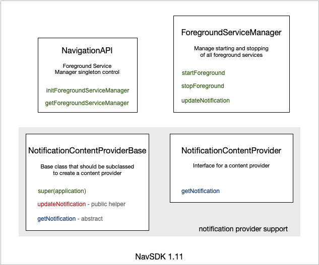 initForegroundServiceManagerMessageAndIntent()orinitForegroundServiceManagerProvider()early so that the expected usage scenario is well-defined. You must call this method before you create a new Navigator. - Be sure to catch exceptions from calls to