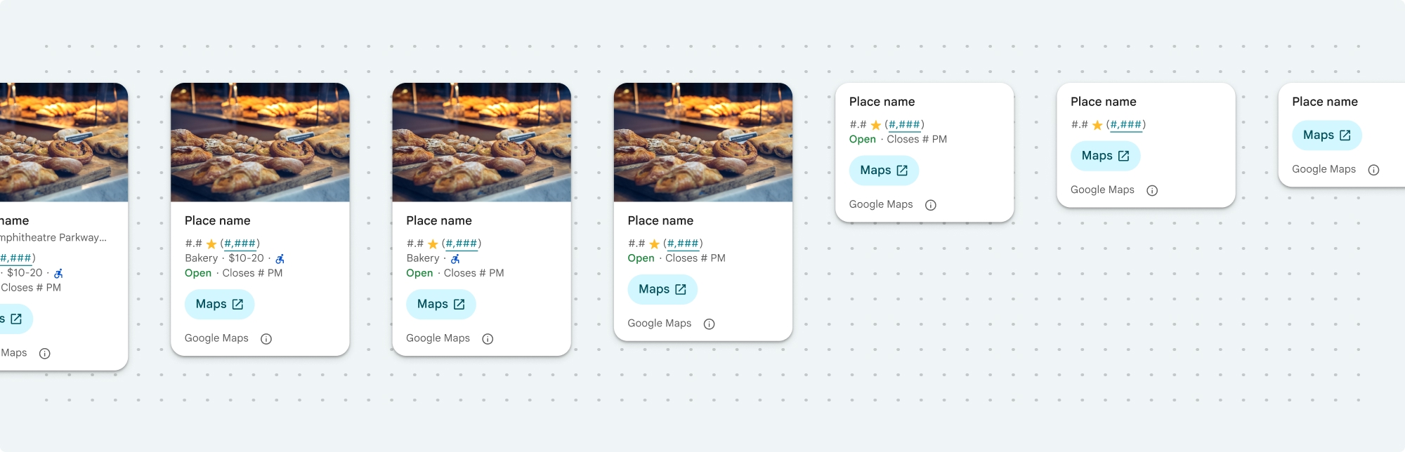 The Place Details compact fragment (PlaceDetailsCompactFragment) renders details for a selected place using minimal space. This may be useful in an info window highlighting a place on a map, in a social media experience like sharing a location in a chat, as a suggestion for selecting your current location, or within a media article to reference the place on Google Maps.