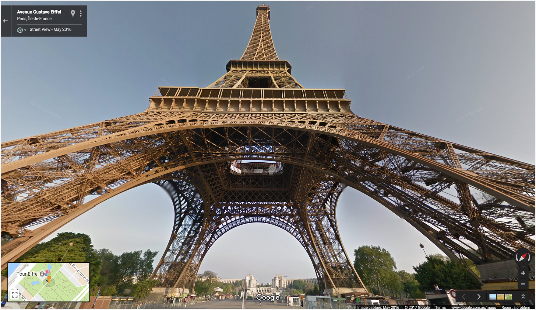 Google Street View provides panoramic views from designated locations throughout its coverage area. User contributed Photospheres and Street View special collections are also available.