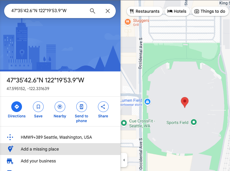 Example 2: Searching for Lumen Field using only latitude/longitude coordinates results in the following map. Notice that there is a pin in the map, but no additional place information is provided on the map or in the side panel: