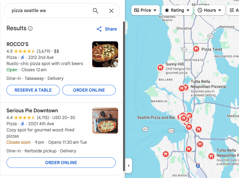 In this example, a search for pizza restaurants in Seattle, WA, results in the following map: