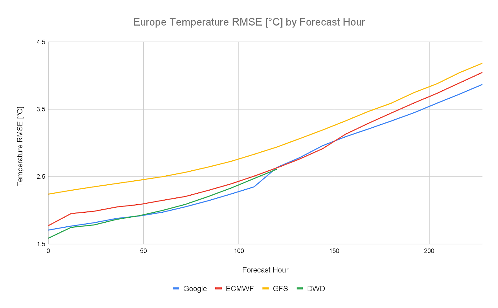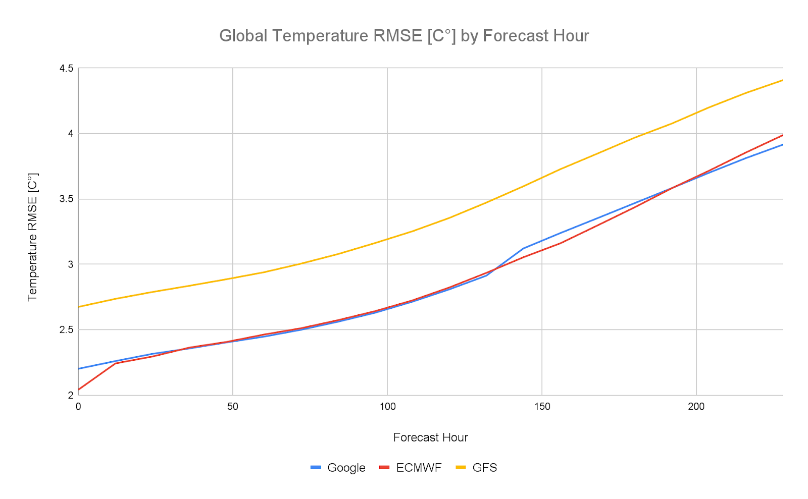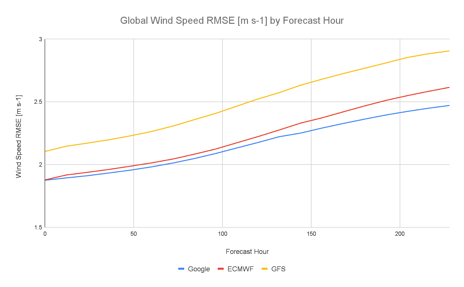 The figures in Table 1 compare Root Mean Squared Error (RMSE) for temperature and wind speed for a 240 hour (10 day) forecast horizon between Google weather data and global and regional weather models from government agencies across 11 months (15 August 2024 through 1 July 2025).