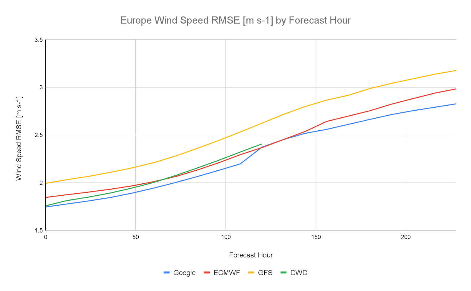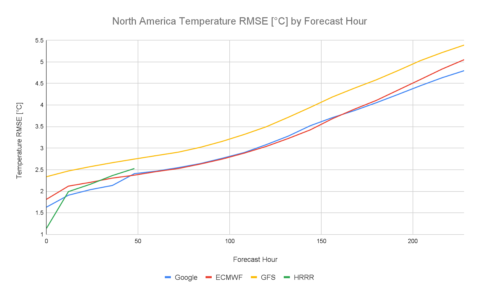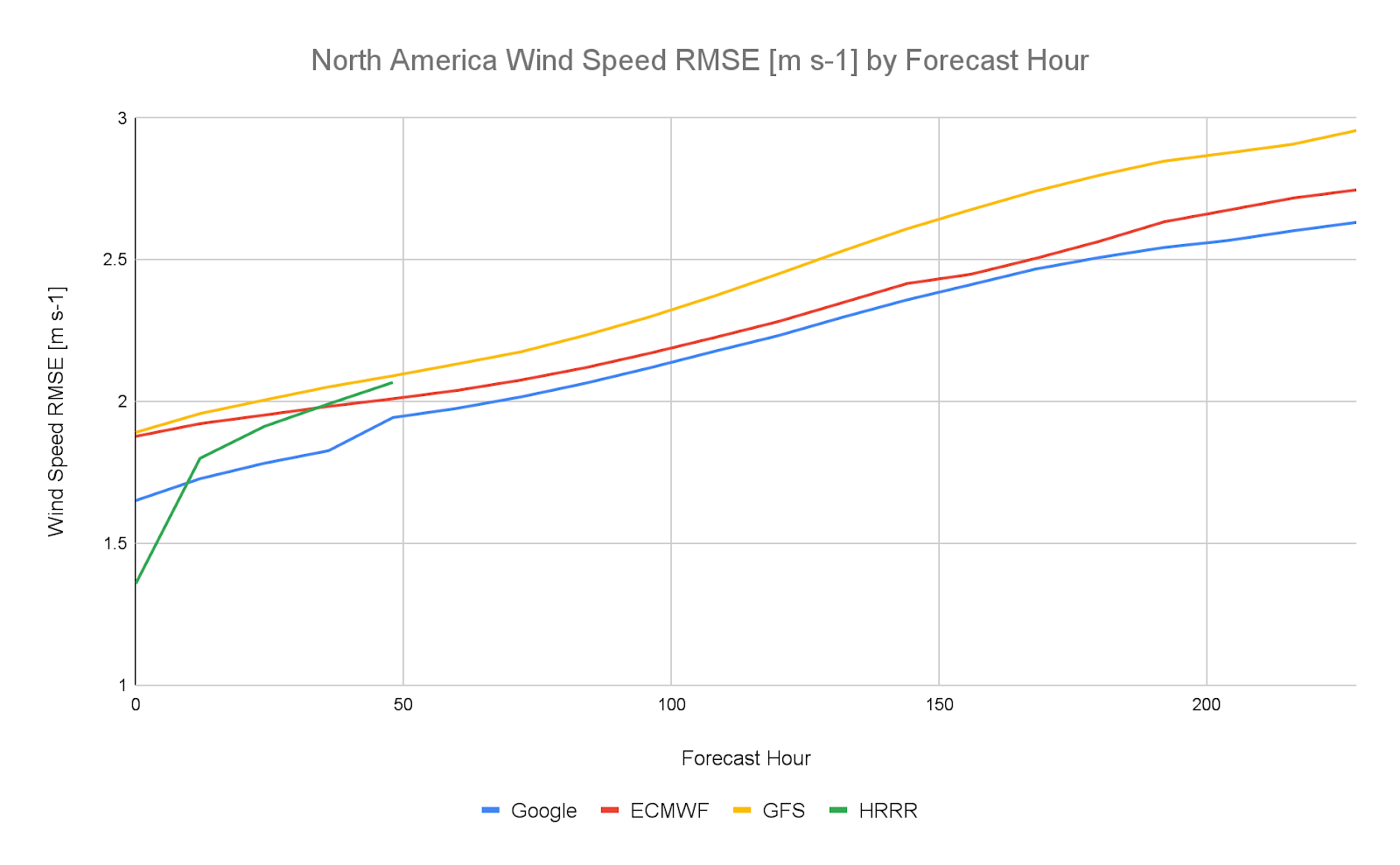 The figures in Table 1 compare Root Mean Squared Error (RMSE) for temperature and wind speed for a 240 hour (10 day) forecast horizon between Google weather data and global and regional weather models from government agencies across 11 months (15 August 2024 through 1 July 2025).