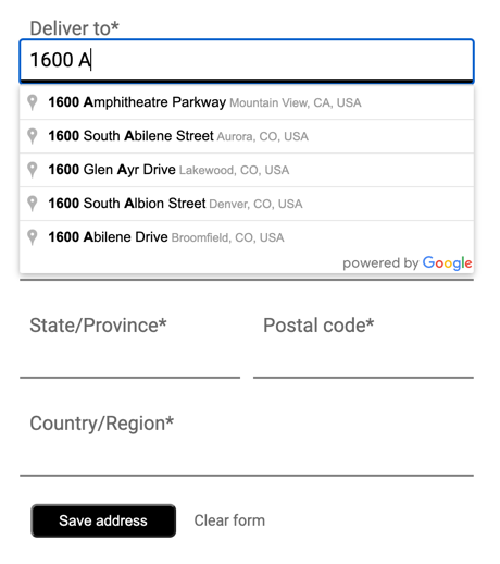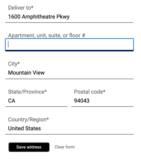 • Leave fields editable in case certain fields are missed from the match and allow customers to update the address if required. Since most addresses returned by Place Autocomplete do not contain subpremise numbers such as apartment, suite, or unit numbers, this example moves the focus to Address Line 2 to encourage the user to fill in that information if necessary.