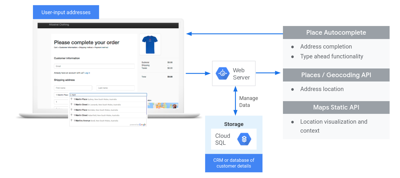 • Google Maps Platform's Checkout solution streamlines online checkout by simplifying and improving the address entry process using address prediction and visual confirmation.