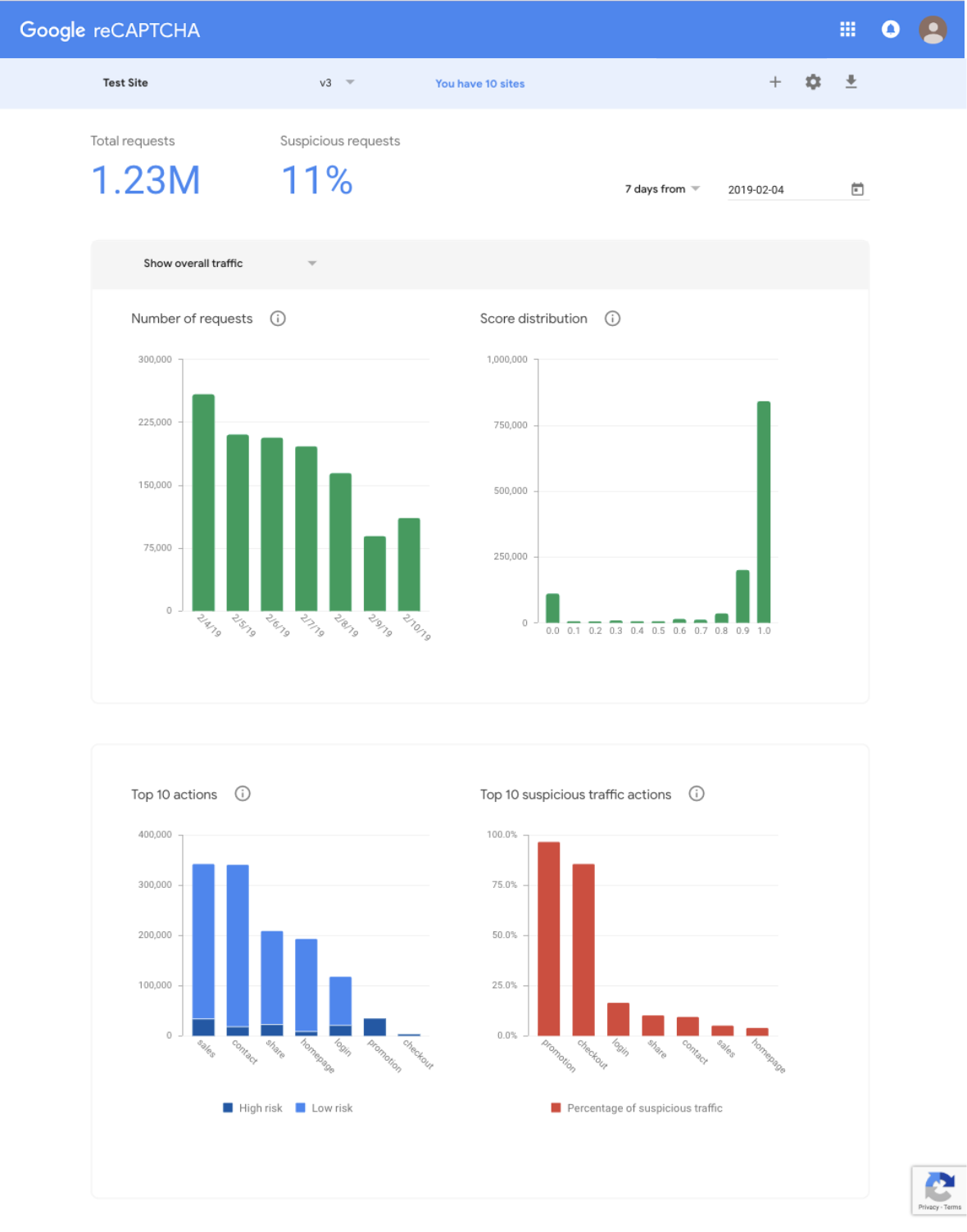 Top 10 Suspicious Traffic Actions This chart shows the top 10 actions (in descending order of percentage of suspicious traffic) for your site. To improve the adaptive risk analysis for your site and to view a more detailed breakdown of your traffic, specify an action name in each place that you execute reCAPTCHA verification.