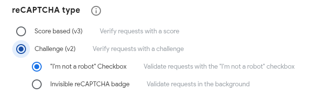 There are three types of reCAPTCHA to choose from when creating a new site. Additional types are available in the Google Cloud console.