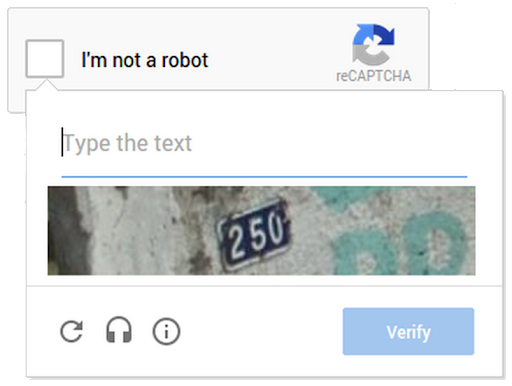 reCAPTCHA protects the websites you love from spam and abuse. So, when you go online—say, for some last-minute holiday shopping—you won't be competing with robots and abusive scripts to access sites. For years, we've prompted users to confirm they aren't robots by asking them to read distorted text and type it into a box, like this: