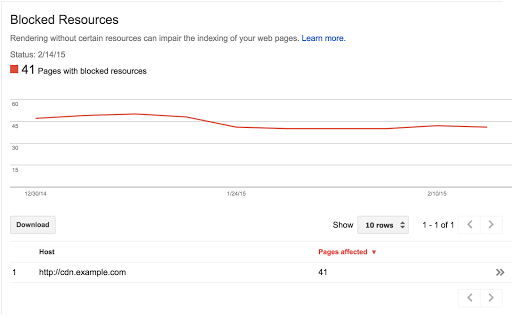 This report starts with the names of the hosts from which your site is using blocked resources such as JavaScript, CSS, and images. Clicking on the rows gives you the list of blocked resources and then the pages that embed them, guiding you through the steps to diagnose and resolve how we're able to crawl and index the page's content.