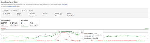 Or, if you have an international website, you can now find the countries where people search most for your brand: choose "impressions" as your metric, filter by your brand name, and group results by country to show a sorted list of impressions by country.