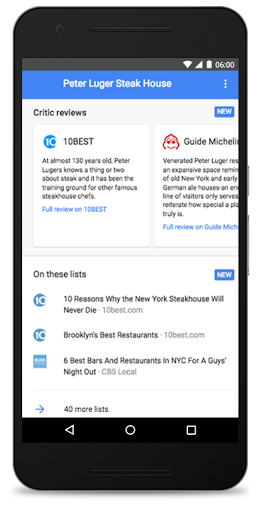 Since the launch of critic reviews last year, we have been focused on supporting more types of reviews, like restaurant reviews, cafes, or any other type of a local business. Recently we've announced the availability of critic reviews for local businesses. By incorporating structured data to their sites, publishers can promote their content on local Knowledge Graph cards and users can enjoy a range of reviews and opinions.