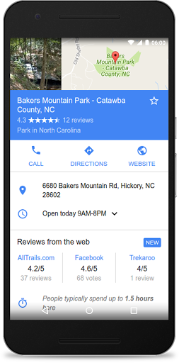 Available globally on mobile and desktop, Reviews from the web brings aggregated user ratings of up to three review sites to Knowledge Panels for local places across many verticals including shops, restaurants, parks and more.