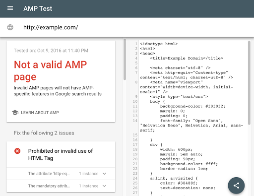 line in the source-code highlighted. For valid AMP pages, we may also provide a link to a live