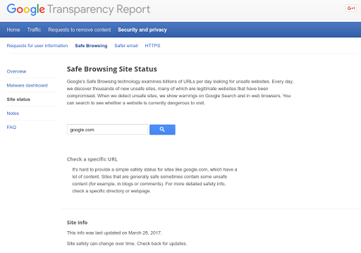 We host this tool within Google's Safe Browsing Transparency Report. As with other sections in Google's Transparency Report, we make this data available to give the public more visibility into the security and health of the online ecosystem. Users of the Site Status Tool input a webpage (as a URL, website, or domain) into the tool, and the most recent results of the Safe Browsing analysis for that webpage are returned...plus references to troubleshooting help and educational materials.