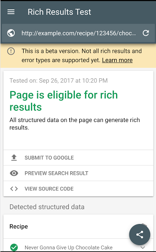 Testing a page is easy: just open the testing tool, enter a URL, and review the output. If there are issues, the tool will highlight the invalid code in the page source. If you're working with others on this page, the share-icon on the bottom-right lets you do that quickly. You can also use preview button to view all the different rich results the page is eligible for. And once you're happy with the result, use Submit To Google to fetch and index this page for search.
