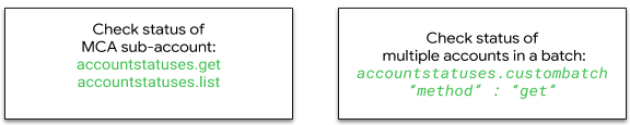 accountstatuses.custombatchwith aGETmethod allows you to retrieve account status information for multiple sub-accounts of an MCA in batch mode. -
