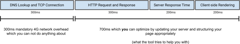 With that in mind, let’s now work backwards. If we look at a typical sequence of communication between a browser and a server, 300 ms of that time has already been used up by network overhead: a DNS lookup to resolve the hostname (e.g. google.com) to an IP address, a network roundtrip to perform the TCP handshake, and an optional TLS connection. This leaves us with 700 ms.