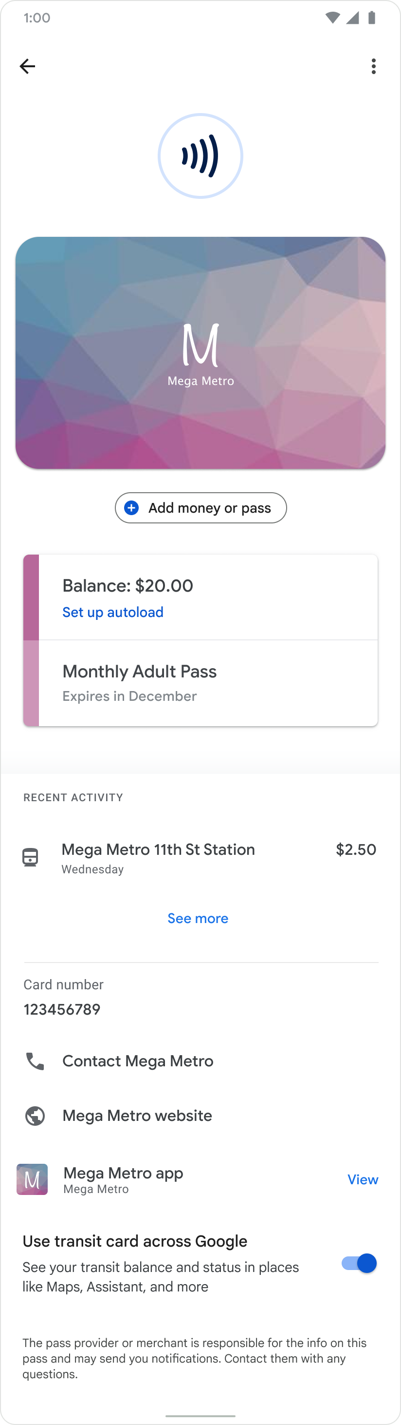 Transit agencies that integrate with one of the preceding solutions can let users purchase and store a virtual transit card on their mobile device. These cards can have a prepaid balance, passes, or both. The cards show important information, such as available balance, and ticket details like expiry, validity of pass, recent transactions, or travel history.