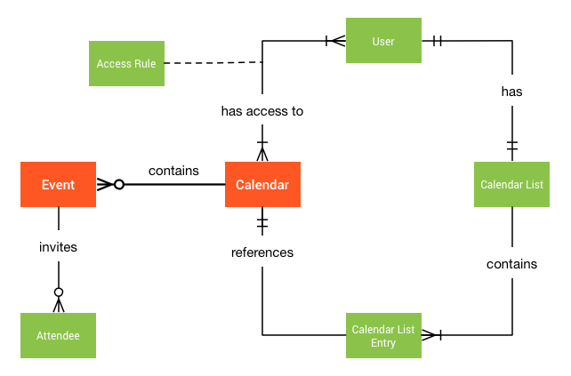 The following diagram shows the conceptual relationship between calendars, events, and other related elements: