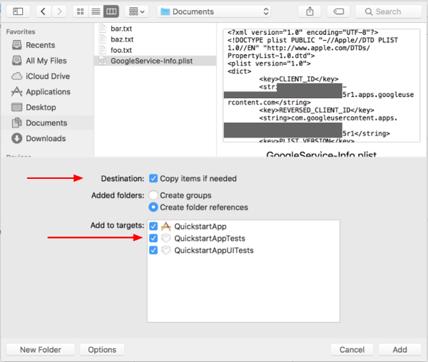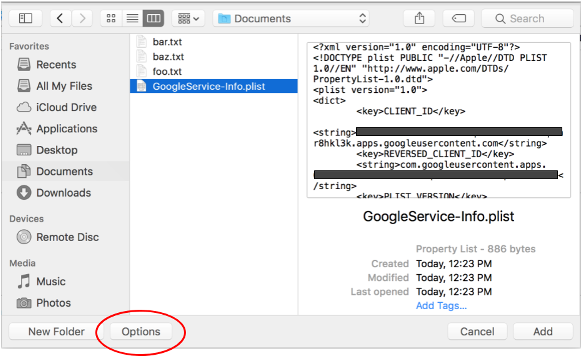 GoogleService-Info.plistfile downloaded earlier and select it. Click the Options button.
