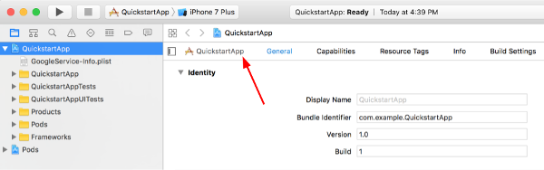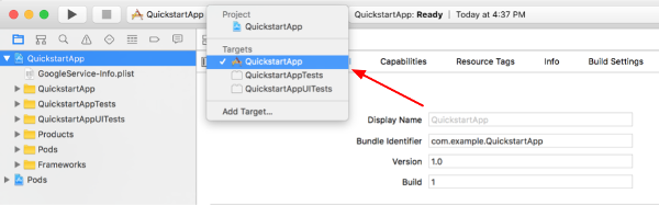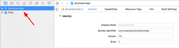 With the project node still selected, select "QuickstartApp" in the TARGETS section as shown in the two images below: